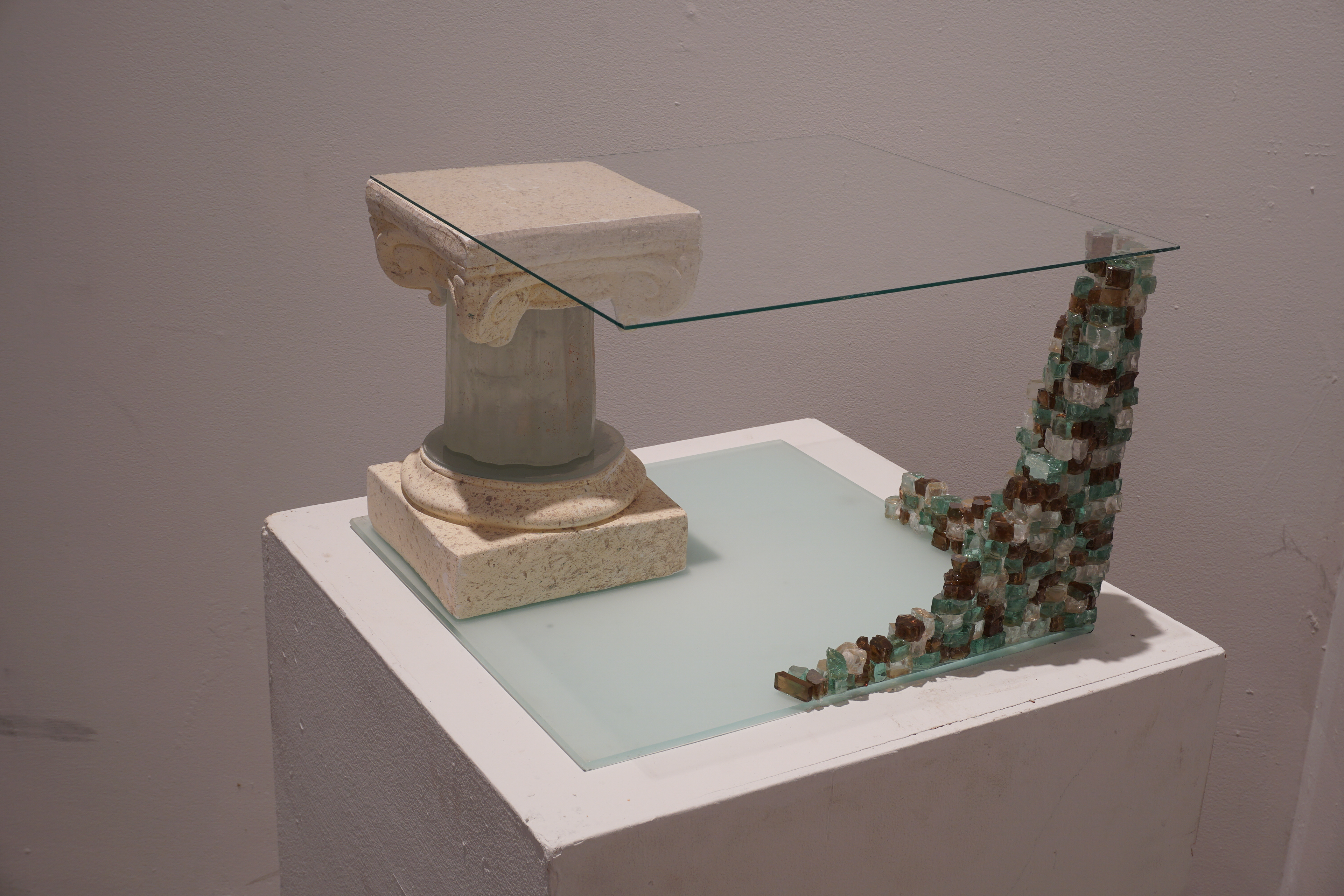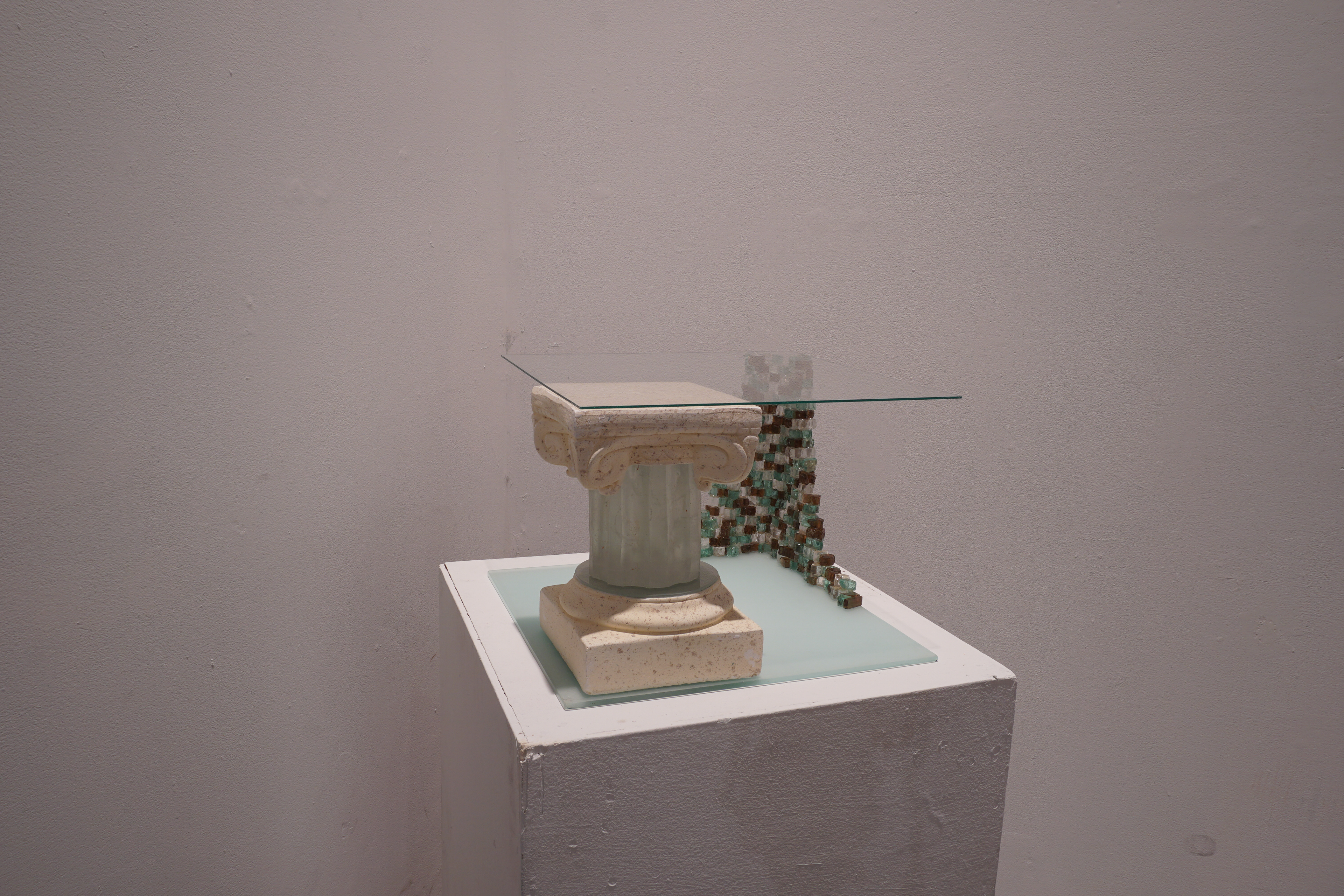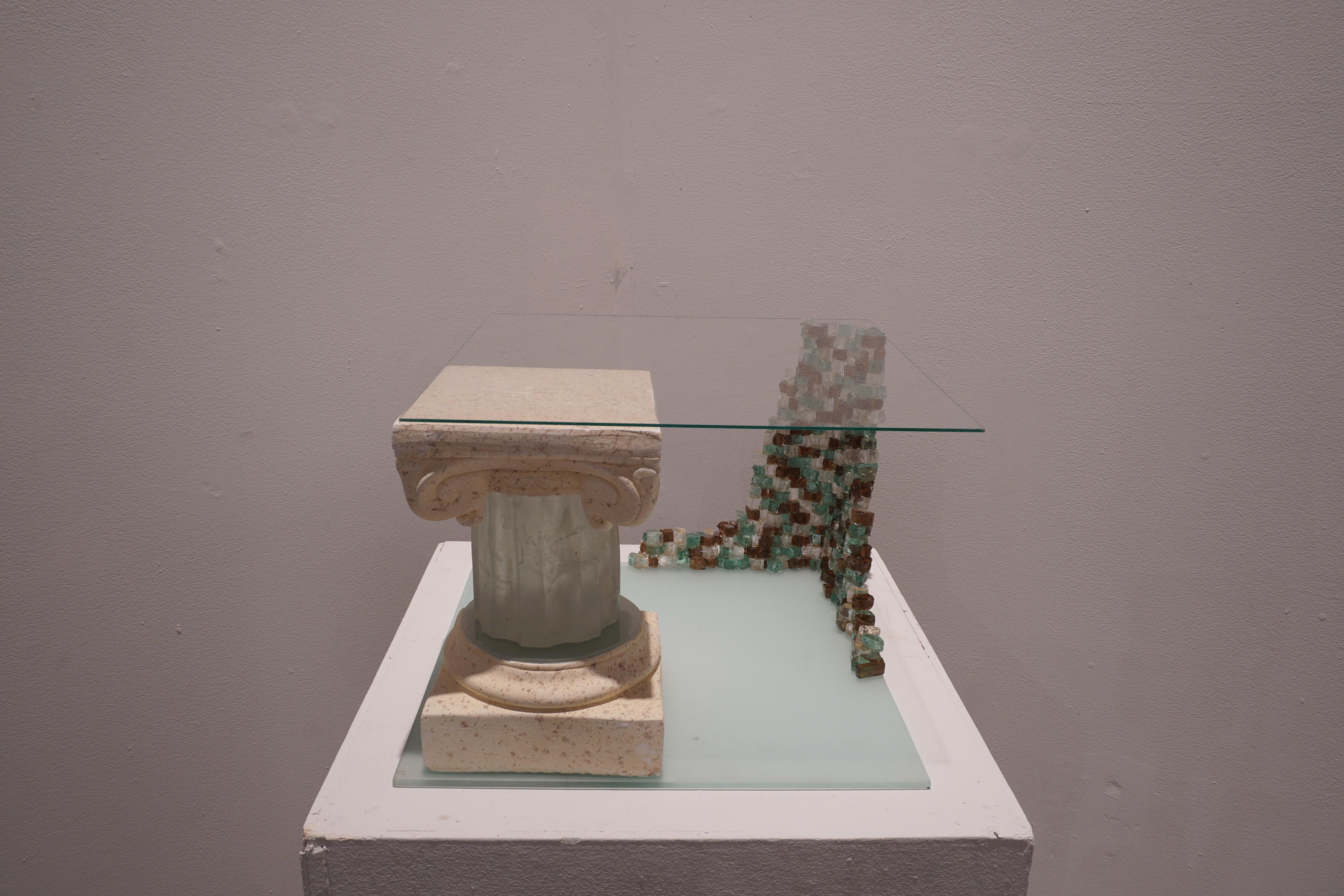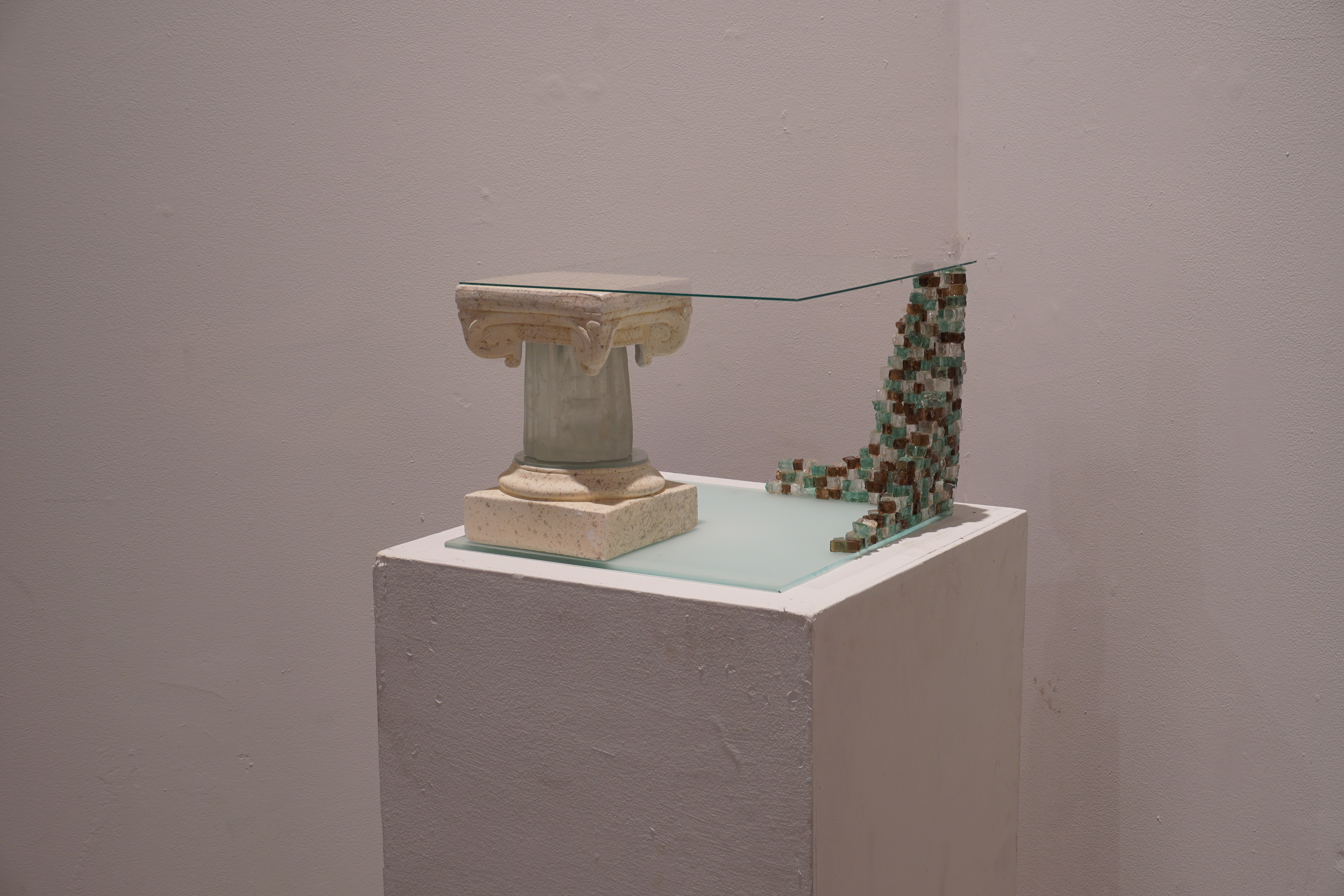 The theme of my final project is architectural historic preservation. My inspiration was the "Glass House Project" by the Menokin Foundation, in which they are preserving a house that was built in 1769 completely out of glass. The stacked shards of glass are supposed to represent a building structure that is falling down and barely holding up the ceiling element, while the column is supporting and holding up the whole structure. The ceiling and base are made from cut sheet glass, the crumbling wall is little pieces of glass that I glued together, and the column is made from a glass mold and a plaster column that I cut the capital and base off of. The goal of this project was to experiment with casting glass and to include mixed media in the final deliverable.